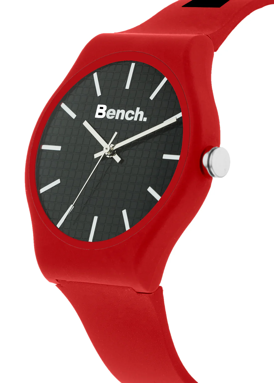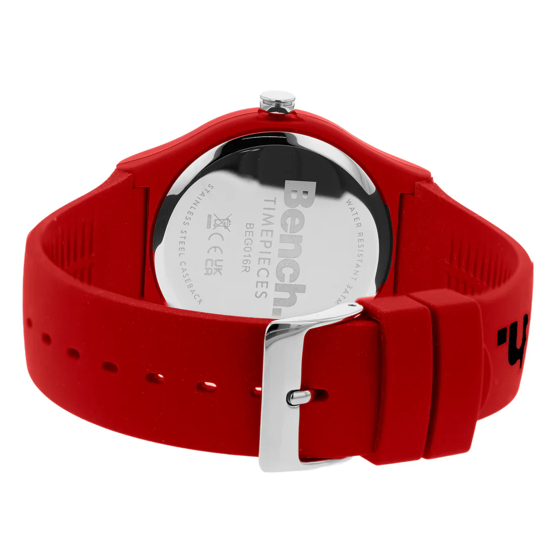 The Bench BEG016R Men’s Watch is a bold statement of style, radiating energy and confidence. Its 40mm black dial exudes sophistication and contemporary charm. Crafted with durable plastic glass, the watch face ensures long-lasting clarity and protection. The vibrant red silicone straps not only offer a snug and secure fit but also add a pop of colour to your ensemble, secured with a practical buckle clasp for effortless wear. Powered by a reliable quartz movement, the BEG016R ensures accurate timekeeping, keeping you on schedule with precision. With a water resistance of 30 meters, it’s designed to accompany you through daily activities, safeguarding against splashes and brief submersions. Bench has ingeniously blended style and functionality in this timepiece, making it an ideal choice for everyday wear. Whether it’s a day at the office or leisurely pursuits, this watch is your vibrant and dependable companion.