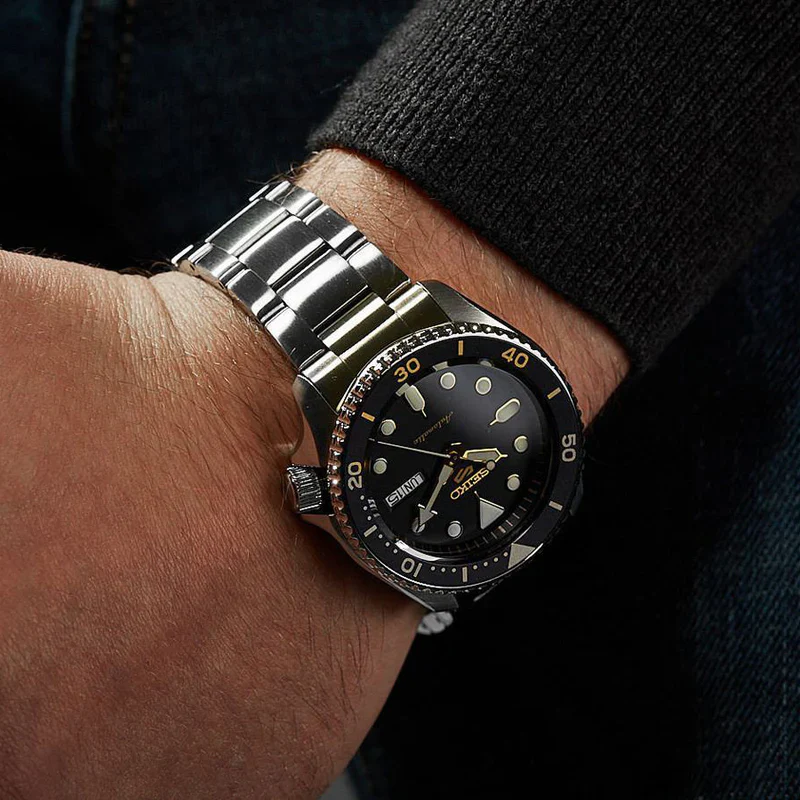 The Men’s Seiko 5 Sport Black Dial Stainless Steel Automatic Watch SRPD57K1 combines over 50 years of Seiko watchmaking heritage with bold, modern styling. Powered by the dependable Calibre 4R36 automatic movement, it offers manual winding, a 41-hour power reserve and consistent mechanical precision. The 43mm stainless steel case houses a striking black dial with LumiBrite coated hands and hour markers for excellent readability in all lighting conditions. A unidirectional rotating bezel, see-through case back and 13mm case thickness add functional depth and visual appeal. Fitted with a durable stainless steel bracelet, this timepiece is water resistant to 100 metres, making it ideal for everyday use, outdoor activities, or as a sophisticated gift for watch enthusiasts. The Men’s Seiko 5 Sport Black Dial Stainless Steel Automatic Watch SRPD57K1 is a perfect blend of style, substance and Seiko’s renowned reliability.
