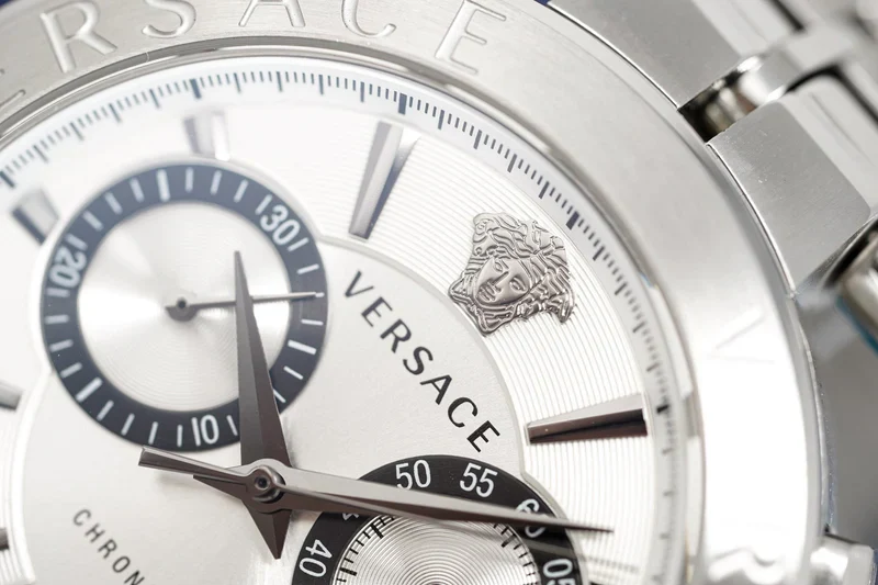 Showcasing refined Italian elegance, this Men’s Versace Aion Silver Chronograph Watch VBR040017 combines Swiss-made quartz movement with the signature luxury elements that define the brand. Housed in a robust 45mm polished stainless steel case, the Men’s Versace Aion Silver Chronograph Watch VBR040017 features the iconic Versace engraving on the bezel and a solid case back etched with the Medusa head, embodying bold sophistication. The clean silver dial is enhanced with polished stainless steel hour, minute, and second hands, a Medusa emblem at 12 o’clock and a practical date window at 6 o’clock. Protected by anti-reflective sapphire crystal glass, the dial offers superior clarity and scratch resistance. The Men’s Versace Aion Silver Chronograph Watch VBR040017 is paired with a durable 21mm stainless steel bracelet with a secure butterfly clasp, offering both comfort and an elegant fit. With 50 metres of water resistance, it is suitable for daily wear, while the push pull crown ensures easy time setting. This timepiece comes with official Versace packaging, making it a perfect gift or personal investment in timeless luxury.