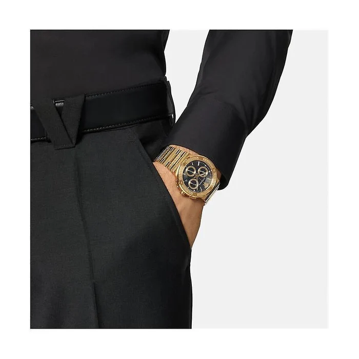 The Men’s Versace Greca Logo Gold Chronograph Watch VEZ900421 is a testament to the brand’s renowned attention to detail and luxury. Its sleek design, highlighted by the iconic Medusa emblem, makes it a true statement piece. The stainless steel case, coupled with the black dial and gold-tone accents, creates a visually stunning contrast that enhances both elegance and readability. Powered by a precise quartz movement, this timepiece not only offers reliability but also maintains the brand’s signature style. Whether worn daily or reserved for special occasions, the Men’s Versace Greca Logo Gold Chronograph Watch VEZ900421 exudes refined taste and impeccable craftsmanship, making it perfect for those who appreciate timeless luxury.